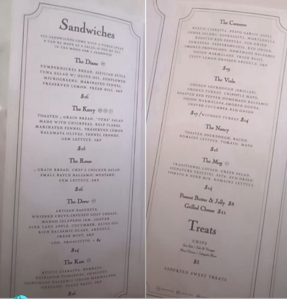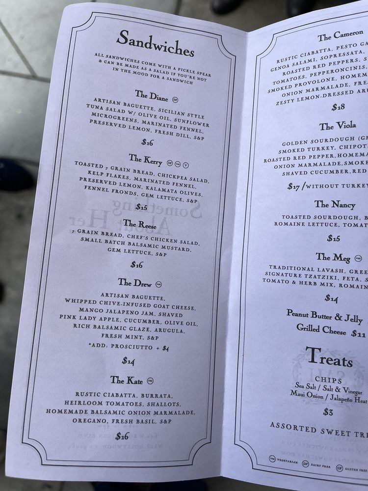 Introducing the menu at Something About Her, a cozy sandwich shop located in West Hollywood. The menu may be limited to a few sandwiches, but customers rave about the delicious flavors and quality ingredients. Favorites include The Kate with turkey and The Drew with added Prosciutto, both receiving high praise for their savory and yummy taste. The ambiance is described as cozy with a perfect feminine flair, making it a favorite spot for locals and visitors alike. Visitors may also catch a glimpse of owners Ariana and Katie, adding to the overall charm of the place. Despite the small location and occasional wait times, the food and service at Something About Her are worth the visit. So if you're a fan of Vanderpump Rules, sandwiches, and a unique dining experience, this is the place for you.
